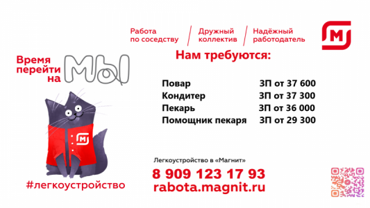 В Гипермаркет "Магнит" требуются: повар/кондитер/пекарь/помощник пекаря Мы предлагаем 1.