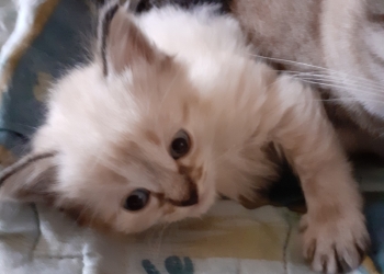 Котëнок рождëн от двух белых сфинксов , но сам почему то пушистый к году скорее всего облысеет по этому отдадим БЕСПЛАТНО...