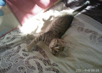 Котенок 1,5 месяца, мальчик, приучен к туалету (лотку), мама кошка отличный мышелов, кушает все.